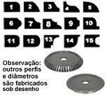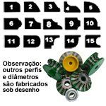 São fabricadas no diâmetro de 90 m/m, para utilização em mármores, granitos, ardósia, pedra mineira, refratários e pedras em geral. Confeccionadas em duas versões: “standart”com guia e rolamento, para serem utilizadas em materiais de 02, 03, 04, 05 e 06 m/m,